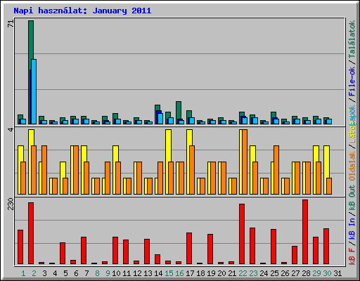| Nap | Találatok | File-ok | Lapok | Látogatók | Oldalak | kB F | kB In | kB Out | ||||||||